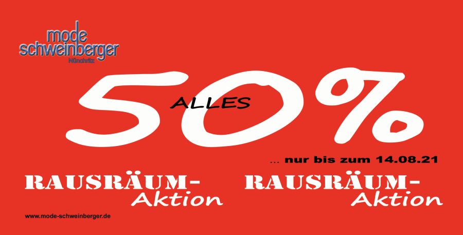 Daher nix wie hin zu Mode-Schweinberger nach Nünchritz und das Angebot sensationeller Preise nutzen. Unser gesamtes Markensortiment haben wir für Sie auf den halben Preis reduziert.